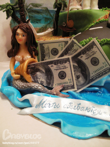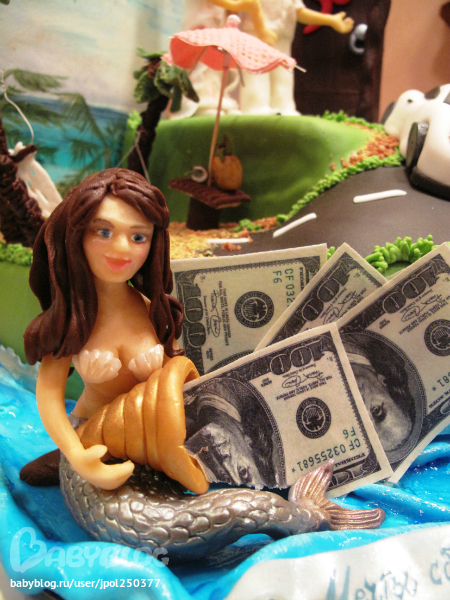 Торты юбилейныеОпять... И к сожалению, не мои)))) Был у меня такой сюжеьец. Чисто повторюшку делать не хотелось, да еще заказчики вдруг вспомнили про день рождения сестры- поэтому ее персону также непременно надо было упомянуть, что в формат торта уж никак не вписывалось((( Воспаленный мозг придумал ее русалкой с рогом изобилия сделать- надеюсь не обидится))) Вообще задача была не столько накормить людей, сколько пыль в глаза пустить- но надеюсь 50 душ из-за 10 кг не подерутся))))))