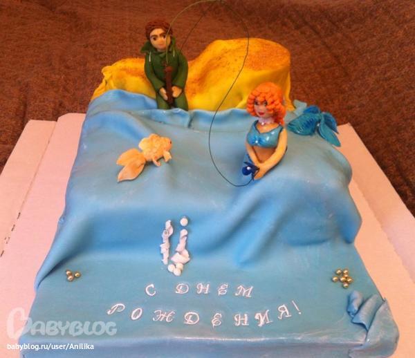 Просили сделать по-минимому украшений, только рыбака, русалку и рыбку. Желание заказчика - закон! Внутри шоколад на кипятке, сливки с маскарпоне, а в островах бисквит и шарлотт.