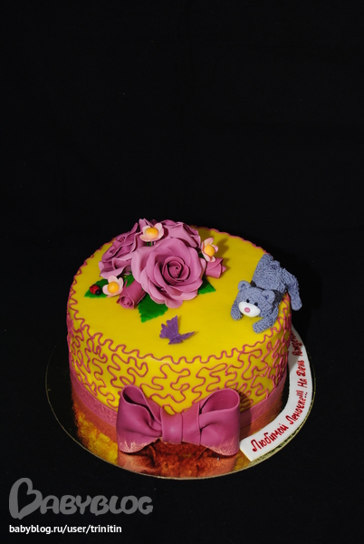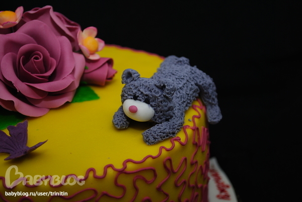 Торты для женщинСначала клиентка заказала копию моего тортика, но потом внесла пожелания и дополнения: яркий тортик, с узором, мишкой и божъей коровкой. Вроде неплохо все вместе получилось, но все-такие божья коровка выбивается из цветовой гаммы - надо было ее тоже сиреневой сделать)))