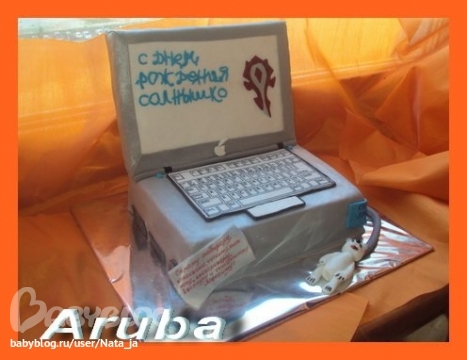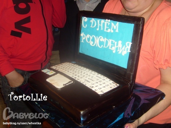 я вообще не заморачиваюсь с ноутами. сразу предлагаю стол с ноутом, а не сам ноутбук, потому что основание ноута из торта смотрится очень толстым и не реалистичным. а так делаешь ноут из желатинки, за 40 минут высохла, клаву из мастики продавливаешь, экран мастичный и вон, как здорово смотрится - глянь в фотоальбоме. а просто крышку из вафли делают, но не очень аккуратно почьи всегда смотрится . а еще можно из коржей для рыжика делать покупных - они прямоугольные и гладкие и прочные