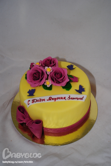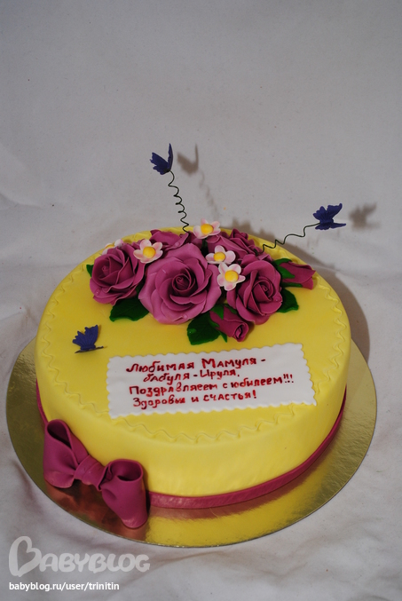 Розы делаю из желатиновой мастики на меду. А цвет - ничего не мешала - краситель наш гелевый сиреневый. Сначала темный, а потом добавляля половину белой мастики, т.е. осветляла на пол тона)
