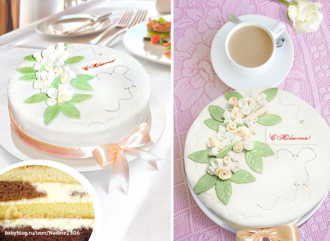 Это мой второй тортик. Внутри лимонное птичье молоко. Мастики катастрофически не хватало, поэтому она получилась не белая, а прозрачная, отчего приобрела темноватый оттенок и прорвалась при продавливании краев.. Мастика самодельная из мармышек, листики лепились по картонному шаблону, корявенькие :)