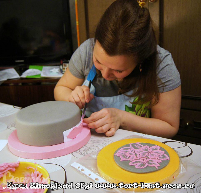 Практически через месяц, я снова пошла к Оле на курс по выравниванию, айсингу, самодельной мастике и использование трафаретов. На этом курсе я отдыхала, по сравнению с цветами))))))
