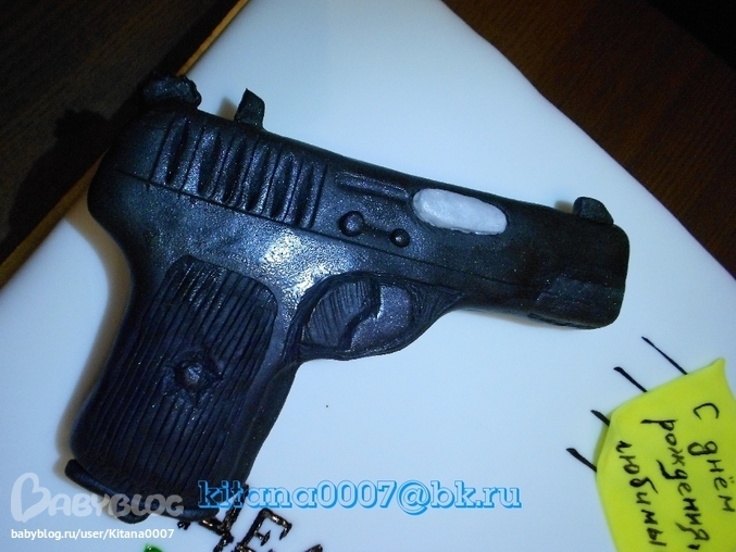Пистолет обтянут мастикой,там пироженка,а размеры торта 27на 36,так что не маленький...