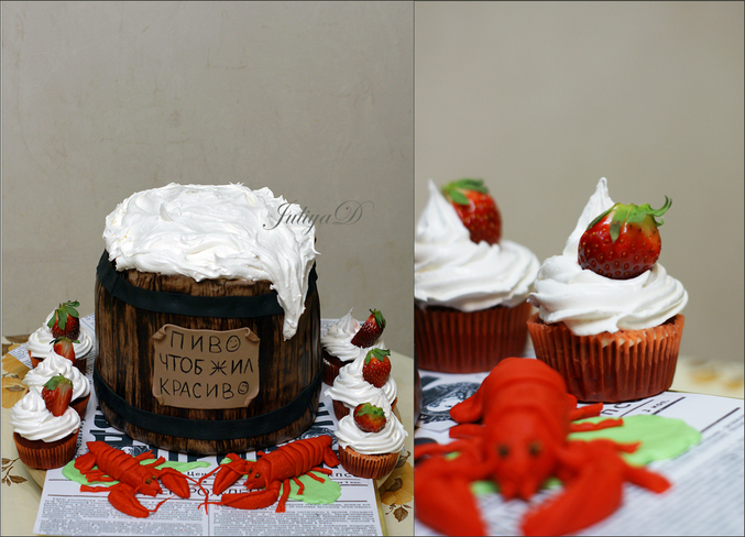 Торты 3ДМоя первая бочка, кадка и раки-сраки 5 кг (бисквит крем на белом шоколаде малина, генеральский крем брюле миндаль), капкейки красный бархат (спасибо девочкам за рецепт) начинка клубничный топпинг.