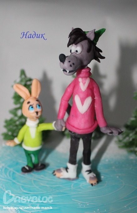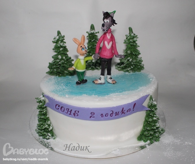 Почти повторюшка, просили именно зиму и мои елочки, поэтому больше как на коньках ничего больше не придумалось, заяц и волк слеплены из принцессы, здесь они мне даже больше нравятся чем на прошлом тортике http://www.babyblog.ru/community/post/konditer/1734488