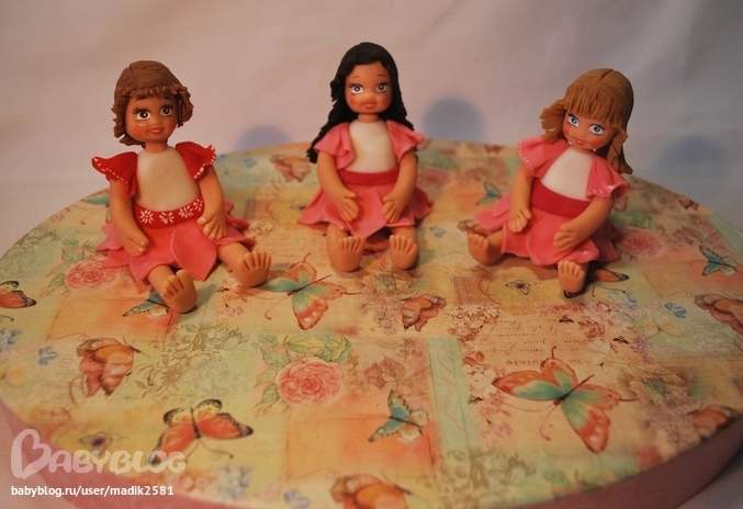 Сначала девочки выравняли тортик,потом мы смоделировали весь декор,покрыли торт мастикой,украсили его рюшами и поставили фигурки)
