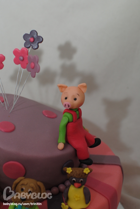 Торты детские"Кривой" тортик с героями программы спокойной ночи малыши в розово-фиолетовой гамме