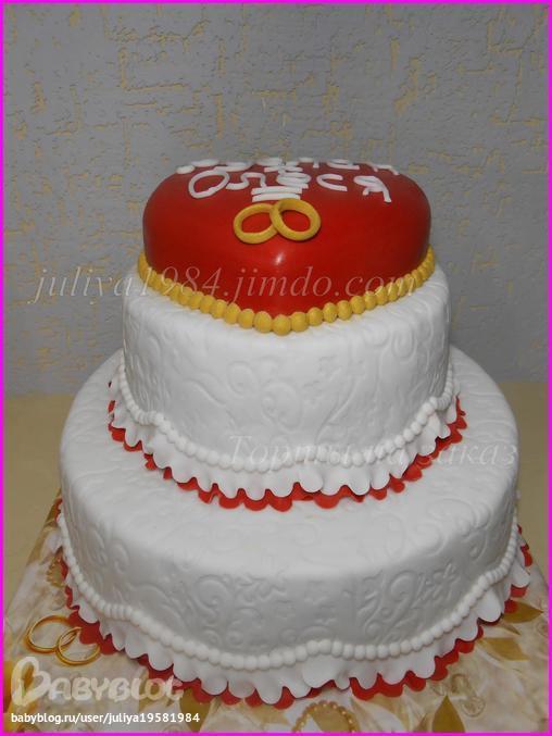 Торты свадебныеНу вот собственно, что получилось. Честно сказать, мне почему-то кажется что лучше было бы отказываться от надписи и сделать сердце меньше или сделать 3 ярус такой же как 1й и 2й, и верх 3го украсить. За дизайн был ответственным жених, поэтому слушали в основном его пожелания:)))Заказчики к сожалению не отписались (Яночка, может ты скажешь нам пришелся ли тортик по вкусу, уверенна,что ты обязательно прочитаешь этот пост))). 1й ярус - медовый с кремом на основе вареной сгущенки и грецкими орешками. 2 й ярус - шокладные коржи пропитанные вишневым сиропом, сливочно-сырный крем, шоколадный мусс, вишня. 3й - молочная девочка с персиками и бананами. Общий вес - 11 кг.