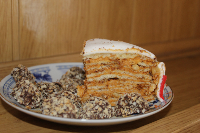 Торты для женщинМногослойный с карамельным кремом и грецкими орехами.Подарок подруге