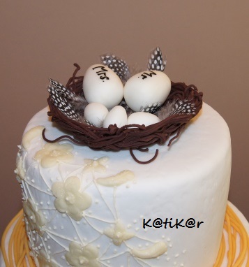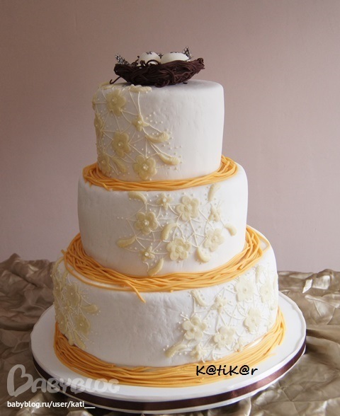 Торты свадебныеНевеста - чудесная, маленькая, худенькая девочка, но такая настойчивая!! Хочу говорит, чтоб мастика была не гладкая, а корявая. А ещё солому хочу, кружева типа старого решелье и гнездо с яйцами....У меня волосы дыбом встали..Но она всё отвоевала не сдаваясь ни на миллеметр))))