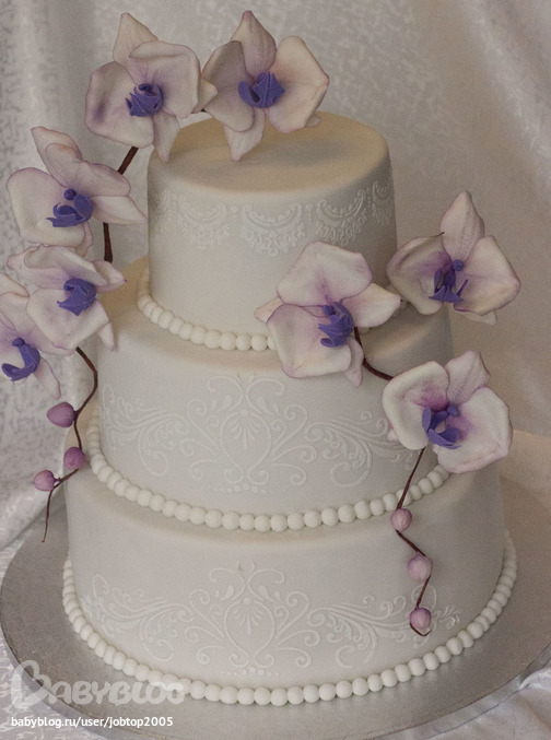 Поняла, что я очень скучала по цветам. На фото не очень видно роспись айсингом. И торт, конечно, белоснежный, а не серый как на фото. Свет, зараза такой, зимний :). На длинной ветке орхидей надо их было подальше друг от друга делать, смотрелось бы декоративнее, так на венок какой-то похоже, не видно каждый цветок. Высота ярусов 10 см, диаметр 26, 20 и 12.