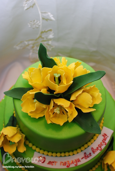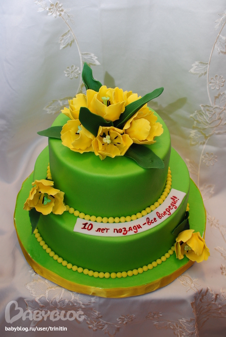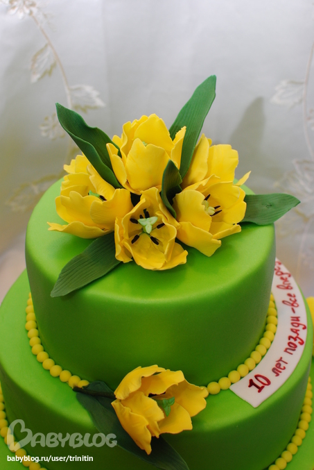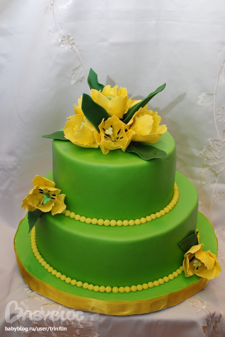 Торты свадебныеТортик на 10-ю годовщину совместной жизни, сначала планировались сиреневые орхидеи, но потом клиентка сказала, что нужен салатовый тортик с желтыми тюльпанами.