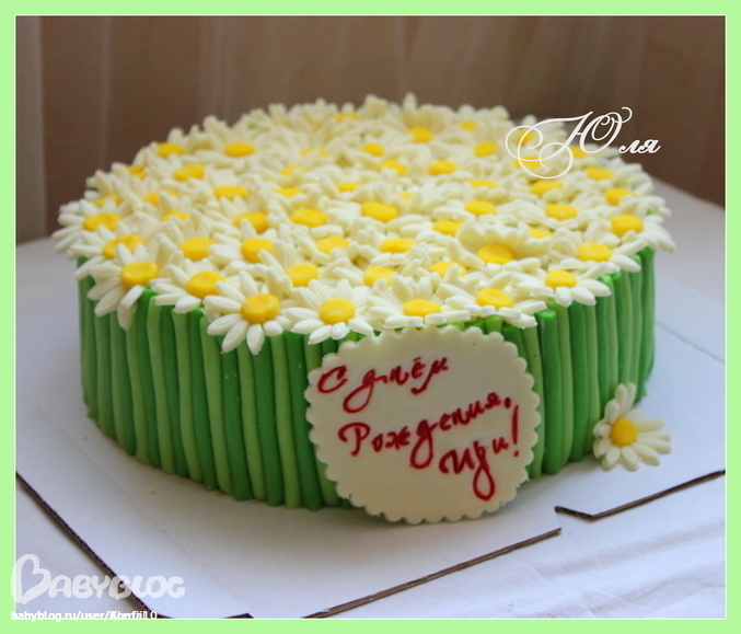 только мастику раскатайте тоненько для ромашек.. будет нежней смотреться.. тут очень грубовато,