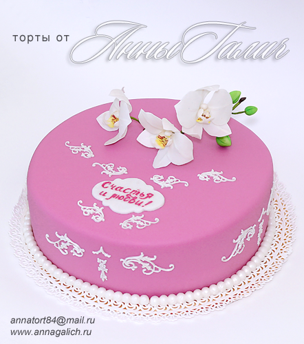 Торты для женщинТорт с орхидеями. Вес 3,2 кг. Внутри: маковый бисквит, творожный мусс, орешки грецкие, курага и чернослив в сиропе. Диаметр торта 23 см. Высота 7 см.