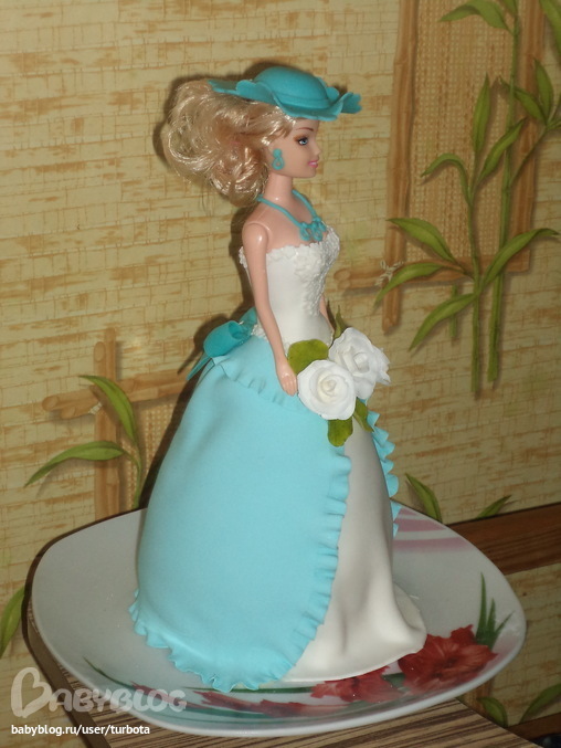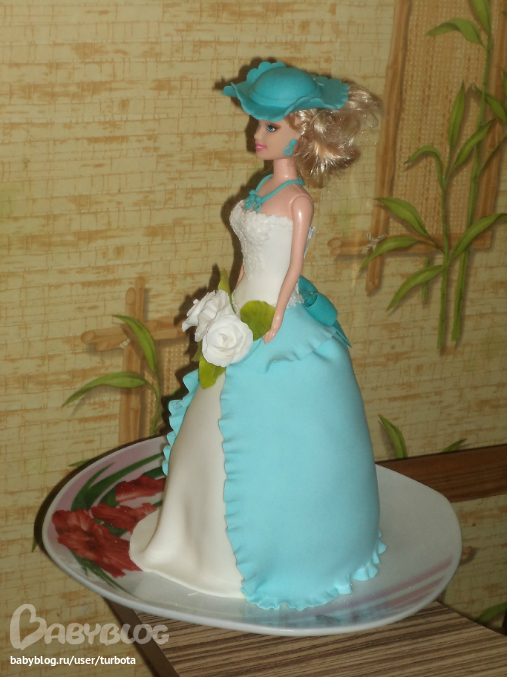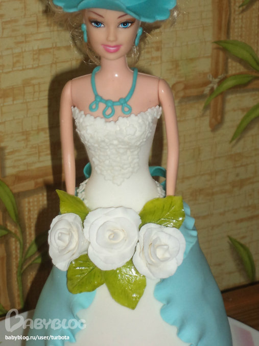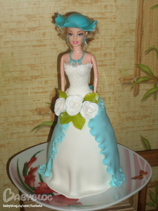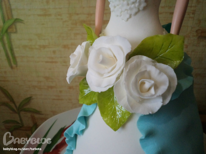 Проба пераСегодня долелала наконец-то свою куколку)),, Теперь будет ждать завтра. Первый раз пробовала шифоновый бисквит..Сделала видимо темп. выше 180...короче он вроди пропекся..на 95%))), осел короче он у меня..Надо купить градусник в печку. пеку на советской, и там его нет, сколько себя помню не было. На прослойку взбила сливки с сахаром, ну и обмазала белым ганашем с белым шоколадом..Не хотелось вкуса шоколада-како ..Эта девуля была такая длинноногая(((..А бисквита было мало, печь второй было лень))). В задумке было платье попышнее..пришлось обрезать и добавлять верх, сколько смогла. Первый раз делала мастичные розочки, очень понравилось)). вчера испекла и промазала, сегодня встала в 3 утра-ночи, довыравнивала, слепила розы, и "одела", шляпку, бант сзади, бижутерию и листики зеленые под розу сделала пару дней назад. В 9 утра только закончила и сразу фоткать.