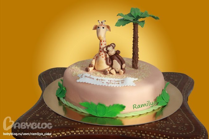 Заказали,чтоб присутствовали объезянка и жираф.Но торт не должен был быть похожим на детский.Не знаю придумала вот так...