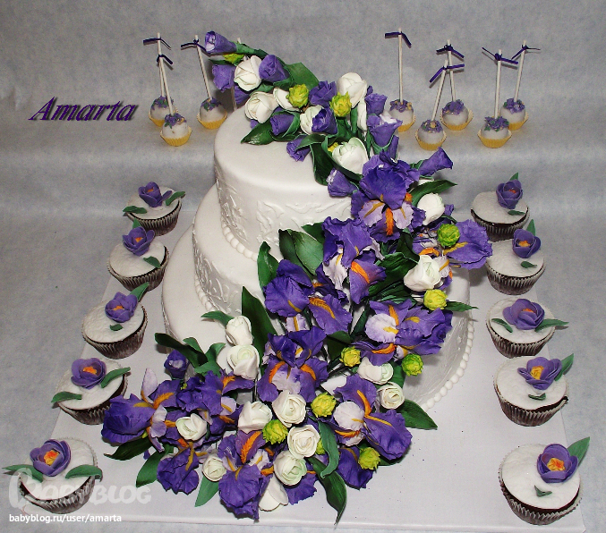 Свадебный торт с ирисами.Вес 12 кг. Медовик,Шокошифон с черешней и кокосовым кремом,Пина-колада,шоколадные капкейки с желе из красной смородины,шоколадные кейк-попсы в белом шоколаде.далее много фото.