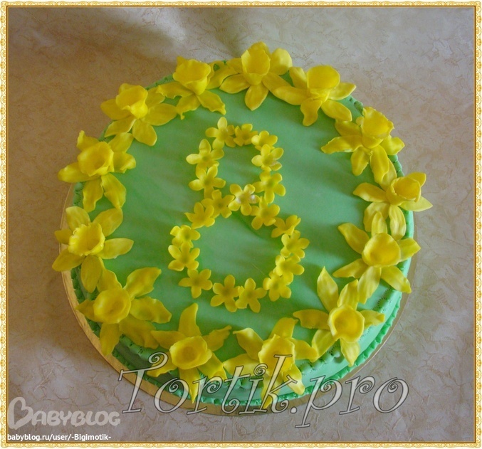 Торты тематическиеВот такой солнечный тортик получился у нас с Машулькой))) Нарциссы её работа)))