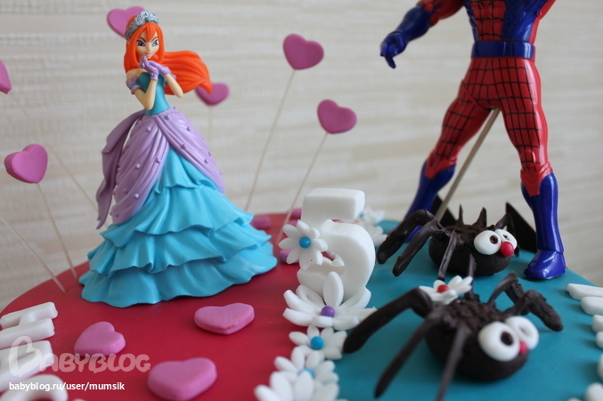 Винкс в платье Волшебна!!! Я от неё глаз не могла на тортике оторвать, а Человек вредничал, в 6 утра отклеился и рухнул на все домики, у пауков от страха пара ног отвалилась, они вообще нервные, все время лапы откидывали ))) Человек был наказан, насажен на шпажку !!!