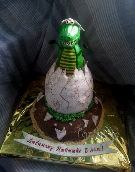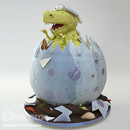 да. динозавр из рисовой массы сделан-в него шпажку длинную. и потом в торт его.... сверху яйца (на чем динозавр стоит) кружок белой мастики накладывала...потом раскатала большой кусок матсики и обтянула сверху-разглаживая бока..верхушку не трогала...как разровняла бока-надрезала верхушку, приподнимала и обрезала имитируя края скорлупы ...приподняла и вставила по кругу зубочистки, чтобы высохли....у меня самодельная мастика-сохнет быстро.