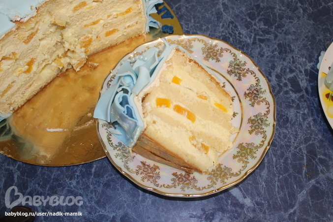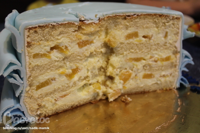 Муж как-то холодно отнесся к моей затее, но при разрезании торта увидел свои персики и сказал: "ДА ЛАДНО?" Вот что было внутри. Крем пломбир похож на мороженое, хотя можно было чуток послаще, но не намного! Очень меня удивил слой марципана под мастикой 1 мм, так и не поняла что за выравнивающий крем? )))