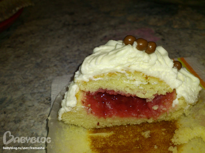 клубничный наполнитель из замороженной малины, делала еще карамельный крем, очень вкусный, фото к сожалению нет.