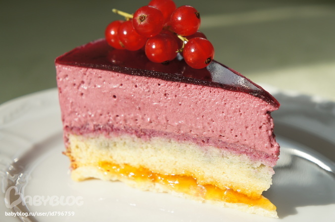 песочный бисквит, джем, бисквит (шоколадный, ванильный, ореховый), пропитанный бейлис + фруктовый мусс (красная/черная смородина/брусника)+фруктовая глазурь:)