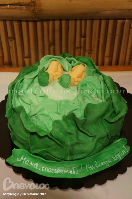 Торты для женщинТортик-повторюшечка моего малыша в капусте, правда, малыши в этот раз сделаны молдом. Торт для уже ооочень взрослых двойняшек на их собственный день рождения для мамы! вот это воспитание... прослезилась... дождусь ли от своих пацанов такого... Вес 3 кг, внутри крем брюле с черносливом и маскарпоне со сливками и фруктами.