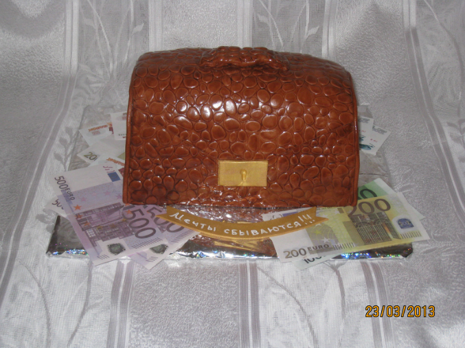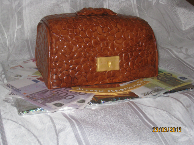 Торты для женщинМоя работа. Делала в подарок двоюродной сестре мужа)) Она всю жизнь мечтает найти барсетку с деньгами))))) Внутри шок. бисквит, клубника, банан, йогуртово-сметанный крем. Вес 2,800. Ручка осела(( Деньги не съедобные. Такой пухленький получился, как будто сундучок))