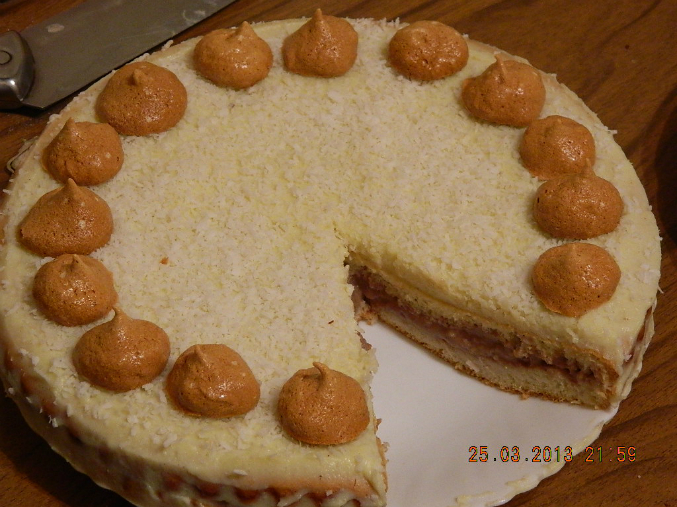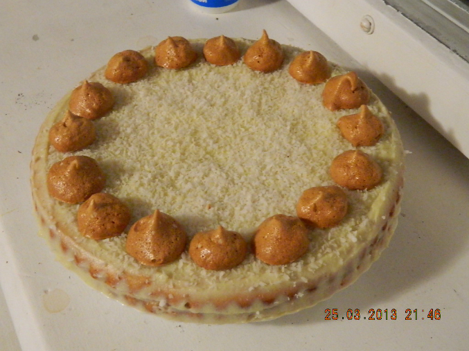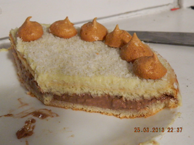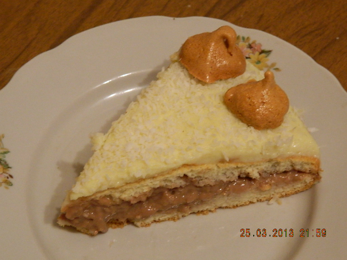 у меня в дневнике рецепт! это бисквит и заварной крем, в прослойку к заварному крему для цвета добавила какао и еще стружку кокосовую, а сверху просто заварным кремом помазала и посыпала стружкой кокосовой , ну и от заварного крема остались белки, сделала безешки, только что то они у меня слишком темненькие