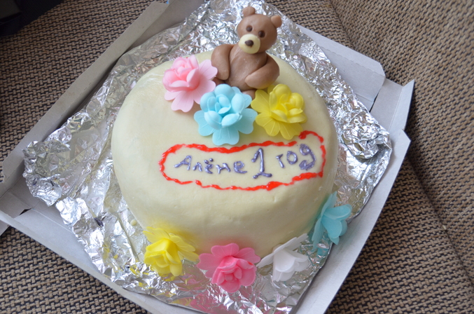Вот таким вышел мой первый в жизни торт. Да, та еще кривулька получилась, но я все равно буду стараться и надеюсь, что второй тортик будет более удачным.