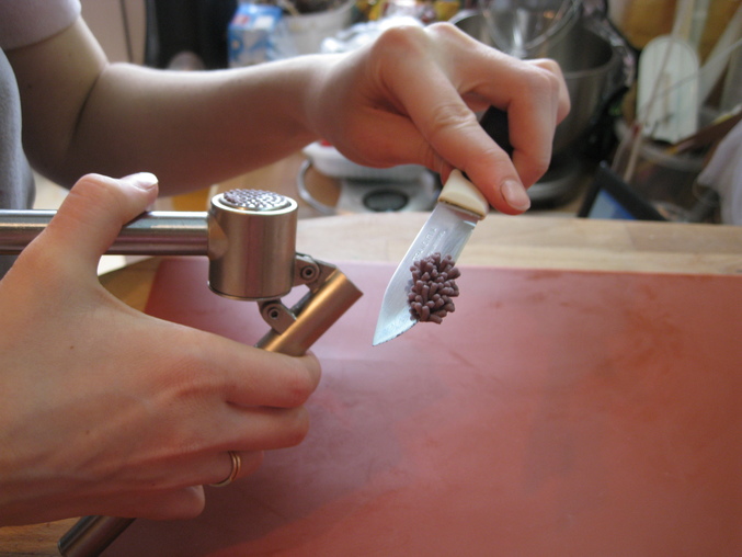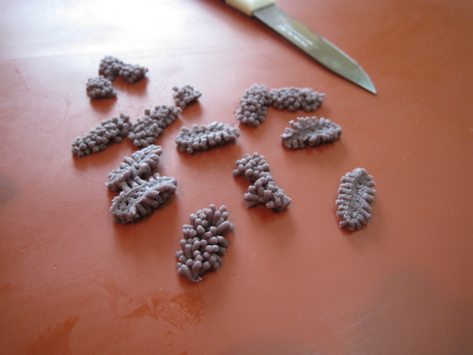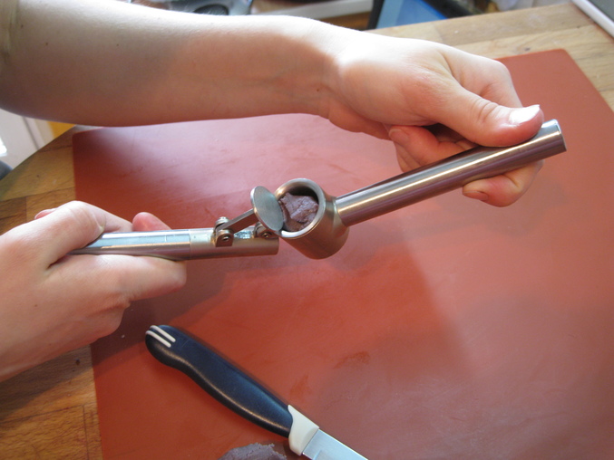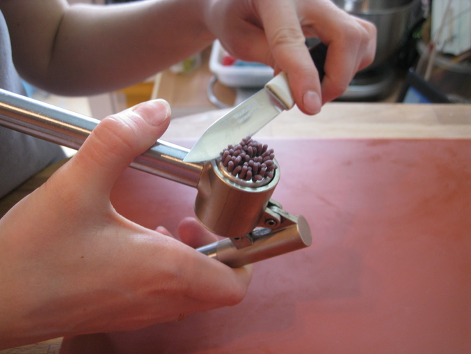 Аккуратно пальчиком снимаем на стол. Далее продолжаем выдавливать весь кусок из чесночницы - получаются вот такие плюшки.