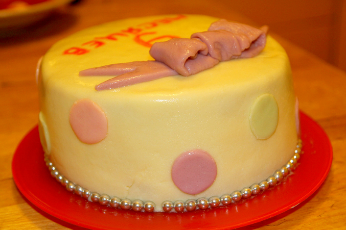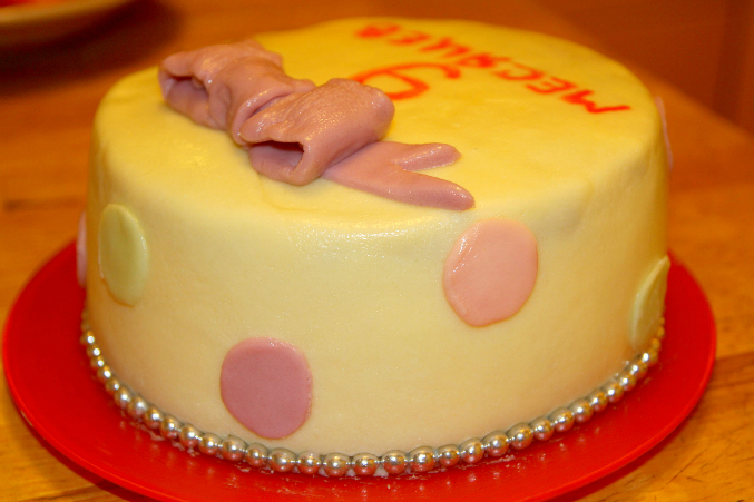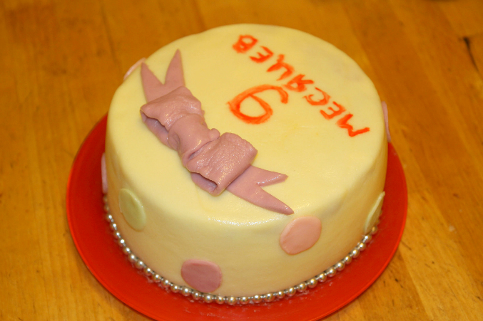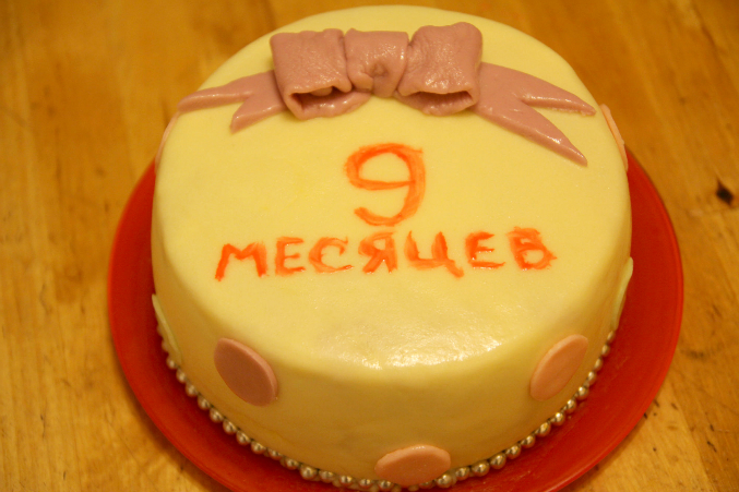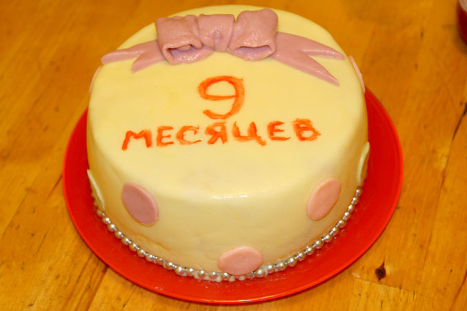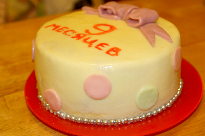 Проба пераВобщем вчера у малявы было мини д.р.-9 месяцев, это не повод конечно,но на что то сослаться нужно было))))) Сделала тортик так сказать проба пера))))))) молочная мастика,все таки нашла я эту консистенцию,чтоб не рвалась,эластичная была(спасибо всем кто подсказал в чем дело). Внутри шифоновый бисквит и сливки с творожком агуша (типа сливочно-творожный крем), фрукты консервированные я не люблю в тортах,а из свежих дома только яблоки были)))))поэтому без ничего)))) но вот чего точно там не хватало,так это жаренных орешек))))) но было уже поздно)))) делала его два дня,т.к деть вобще не давал свободного времени. Да и собственно 80% времени когда я его делала,ребенок был у меня на руках,только когда мастикой покрывала и выравнивала посадила ее в стульчик,но крику было от этого,поэтому я Очень торопилась)))) забыла выровнить масляный крем второй раз ножом с горячей водой(спец лапатки не имею). Шарики(когда то были куплены в невкусном магазине) в низу не в тему конечно,но сил уже небыло крутить их из мастики,нашла дома какие то красители, но эта мастика красится не очень то хорошо как магазинная. Мастику выравнивала лапаткой для готовки)))) вобщем жду ваших так сказать тапок)))))))) критика приветствуется)))) что и как я сделала плохо? вобщем любым комментариям буду рада.Только не пройдите мимо,я начинаю так что мнение профессионалов мне необходимо)))))) много фото