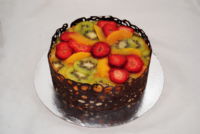 Украшен фруктами в желе и шоколадной лентой из темного шоколада
