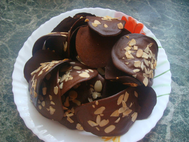 Разлгреть духовку да 170 гр. равномерно разложить миндальные хлопья на противень. обжаривать до легкого золотистого оттенка, примерно 7 минут. приготовить 2 скалки. смешать в маленькой миске муку какао и соль. деревянной ложкой смешайте в большой миске яйцо+белок + сахар. вмешайте мучную смесь и масло. столовой ложкой(я использовала чайную и они получились огроменными) выложите порции теста на противень, на расстоянии 5 см друг отдруга. разравняйе тесто, чтобы получились тонкие круги. посыпьте миндальными хлопьями. выпекайте до затвердения краев 8-10 минут. очень быстро снимите с протвиня и положите на скалку придав форму чипсов.(это реально быстро нужно делать. последние у меня не получалось уже сгинать, очень быстро твердели и трескались на пртвине было их 6-7 штук) и дайте полностью остыть...но необязательно хватает пол минуты чтобы они придали форму и мы их уже лопали горячими и хрустящими. Только расзазывать нужно очень тонко. первый у меня получились толстоватыми, но вкус не поменялся) а втрорые прям прозрачными были))))