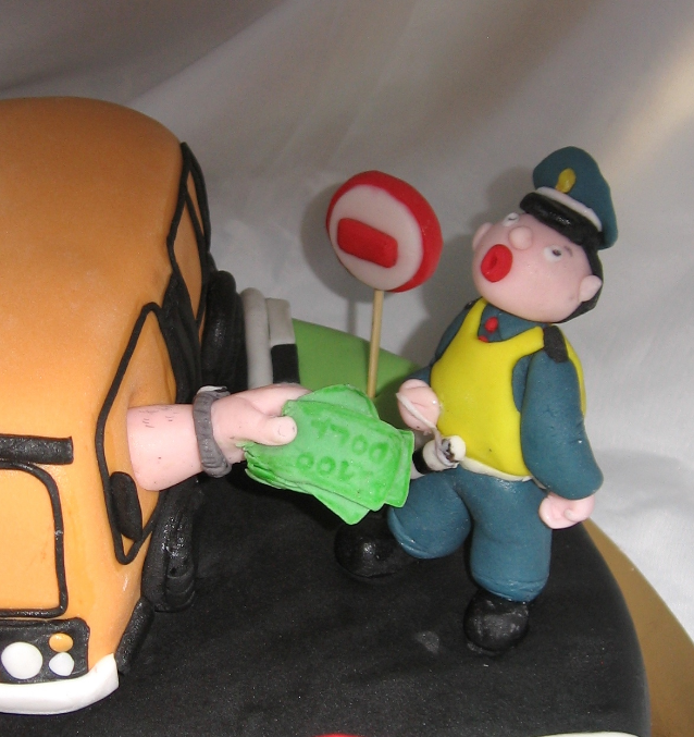 Вот такой интересный тортик мне заказали. Была задача : пазик, рука с деньгами, гаишник. Пазик съедобный (бисквит, сливочно- сметанный крем, персики)