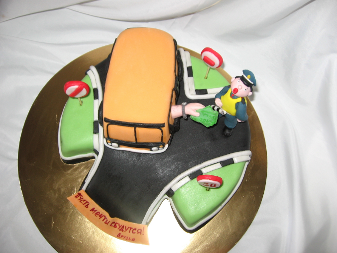 Торты для мужчинВот такой интересный тортик мне заказали. Была задача : пазик, рука с деньгами, гаишник. Пазик съедобный (бисквит, сливочно- сметанный крем, персики)