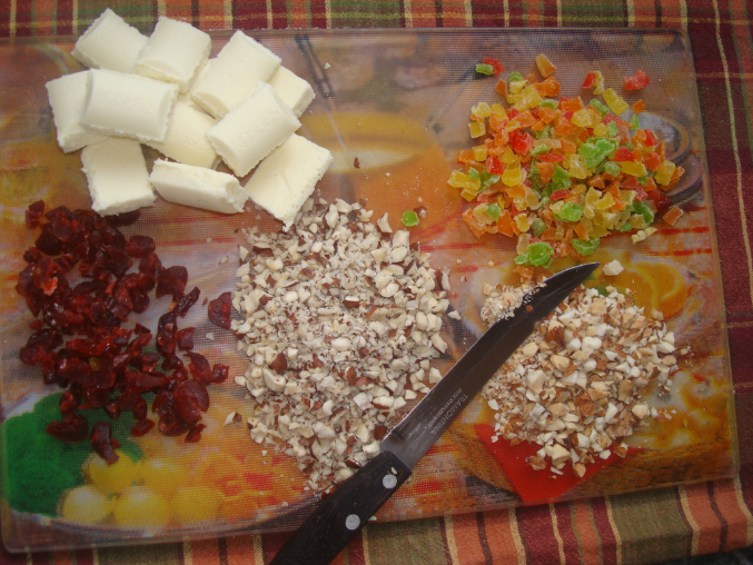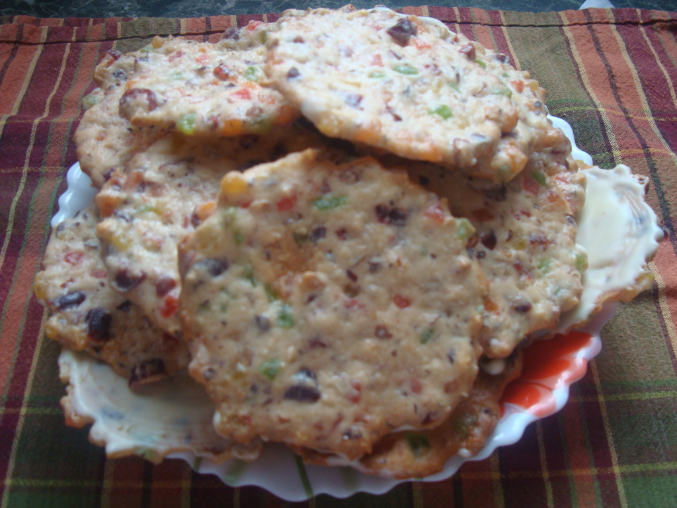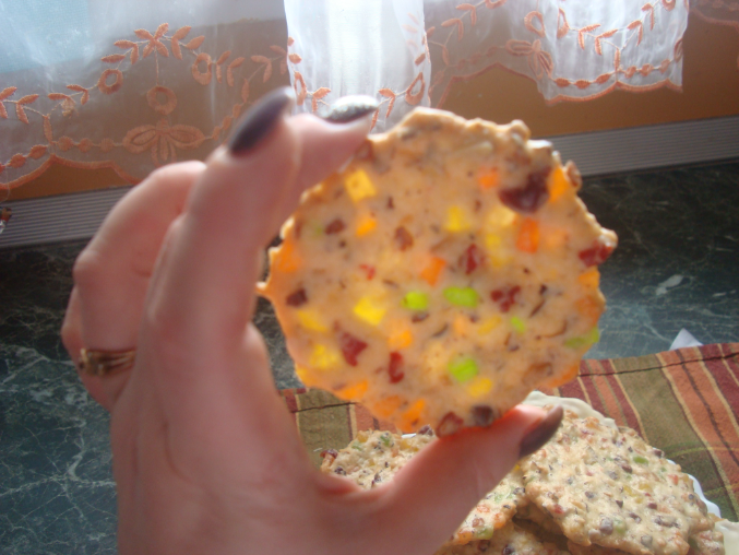 Они к сожалению получились у меня толстоватыми и края неровными. Не знаю, что придумать чтобы ровно их делать, может железное кольцо приспособить при накладывании, но... все равно цукаты и орехи не дают делать ровные края. или может все больше измельчать. в Следущий раз попробую помельче сделать все.