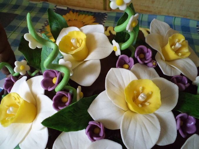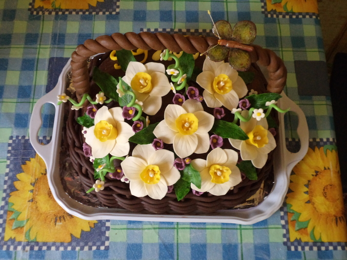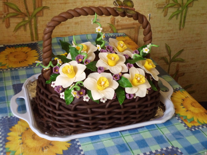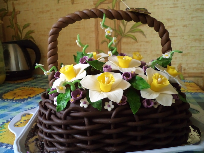 Только недавно "отошла" от эндри бердс, и тут у мамы день рождения, ну как я ей не спеку?. Тем более надо "набивать" руку, скоро тем более прейдет моя хомячья посылочка, и у меня будут хорошие краски и всякая нужная всячина и буду пробовать печь на заказ. Ведь все торты до этого исключительно для домашних и близких родственников. еще не все крема испытала, но думаю это дело времени, Так, торт корзина весенняя. Мамины любимые цветы, Вес около 3-3.5кг. внутри молочная девочка и шоколадная-молочная девочка(подсмотрела на одном сайте рецептик с какао, очень аром атно!!!) Крем сметанный.Мой бок в том, что ручка и корзина разного оттенка, ручку делала заранее и окрашивала краской а когда плела плетенку то использовала шокомастику..(( вот, тупанула немного)))