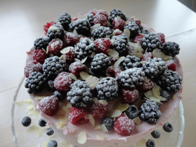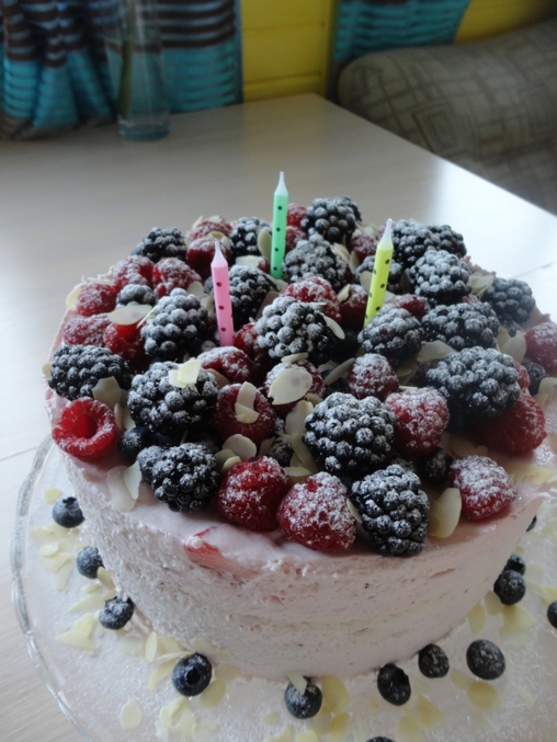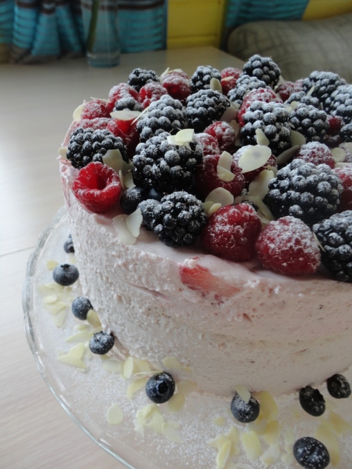 Внутри: ванильный шифон+ клубничный мусс+клубника+ежевика+ черника+малина. Очень вкусный и лёгкий.
