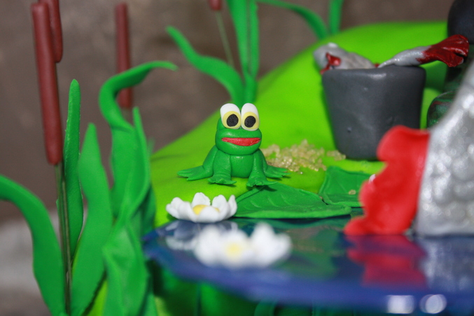 Я, немного мастику надрезала и эту лужицу просто в торт воткнула!!! Делала её с запасом,она в торт где-то на 2-3см. вошла! Перестраховалась,чтобы не вывалилась!