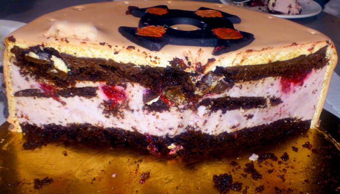 Вес примерно 3,5кг. Шоколадный бисквит, сливочно-йогуртовое малиновое суфле.