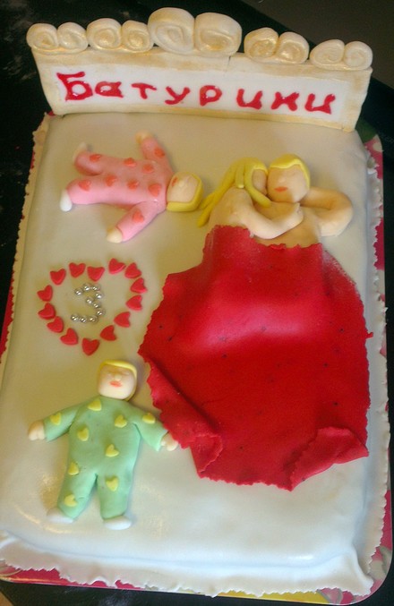 А сегодня вообще, когда покрывала торт, то меня от волнения аж тошнило((( С третьего раза смогла покрыть торт. Ох,как волнительно это было)))) В общем из косяков - отвалившиеся волосы от фигурки девушки и разваливающаяся спинка кровати с надписью... Во-первых, падпись ни ахти какая, а во вторых так и не смогла нормально закрепить спинку, она до сих пор падает во все стороны((((((