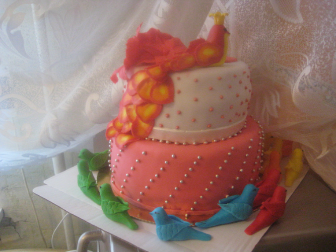 Внизу- ванильный бисквит, лимонная пропитка, сливочно-творожное суфле, клубника. Верх- шокобисквит, вишневая пропитка, сметанный, вишня.