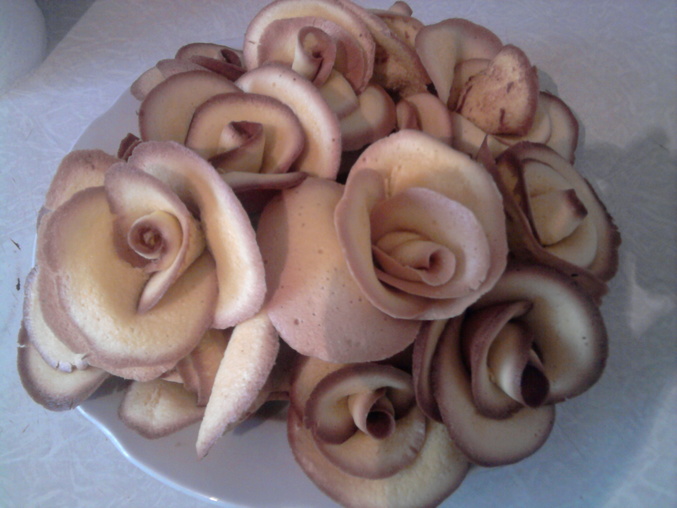Рецепт простой, а процес веселый! Нужно выдерживать пальцами рук достаточно высокую температуру. Вкус сухого бисквита.А украшать еще можно сахарной пудрой,сиропом делать капельки росы.
