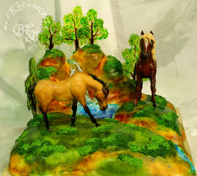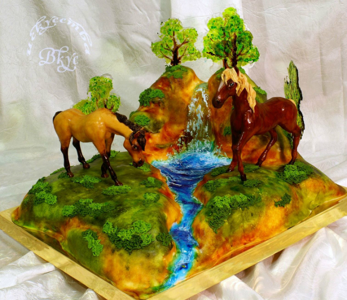 Вот этот тортик возьму в закладочки! Как ты так делашь водичку? Она же как живая! Вода это изомальт или декоргель?...Водопадик поняла, что изомальт, а вот сам ручеек ну никак не угадаю...