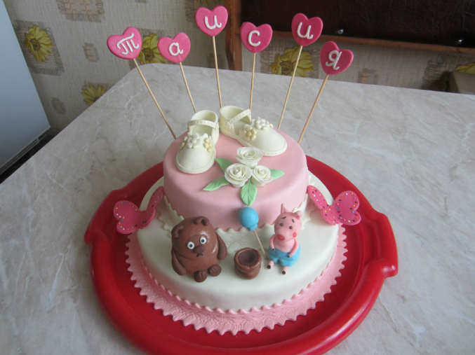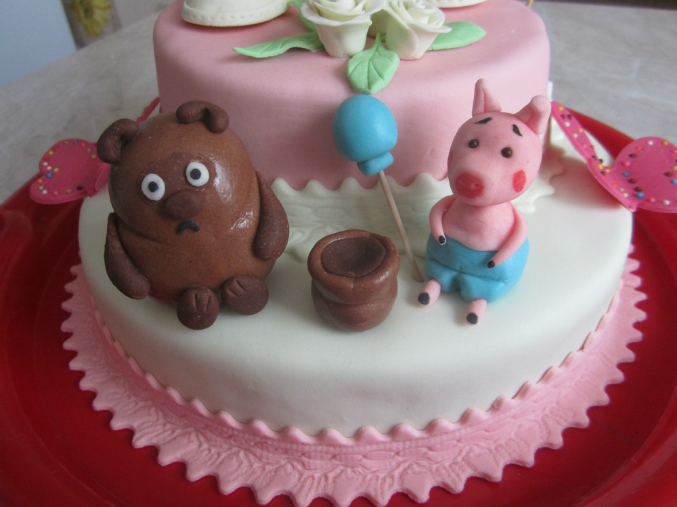 Знакомой на ДР дочки, на 2 годика. Вес 2600. Снизу Рыжик, сверху шок.бисквит со сметанным кремом. Девочка любит мультик про Винни нашего