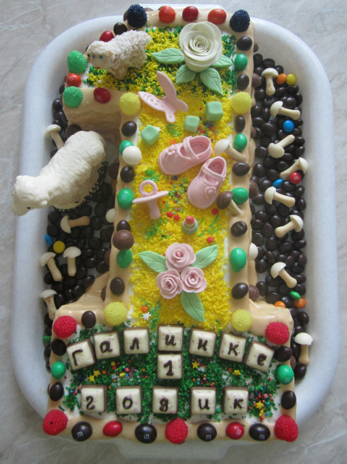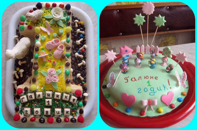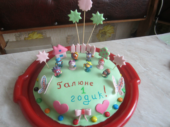 Это я впервые попробовала мастику, у меня мармышковая. Сложно конечно без инструментов, но уже заказала, не могу дождаться. Признаюсь, что смешарики не из мастики, а игрушечные)) У нас тут и с красителями туго, чтоб их слепить, да и навыка и времени не хватало.