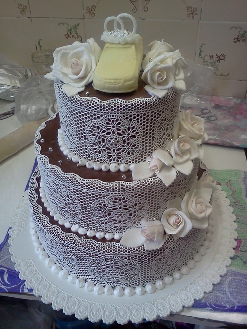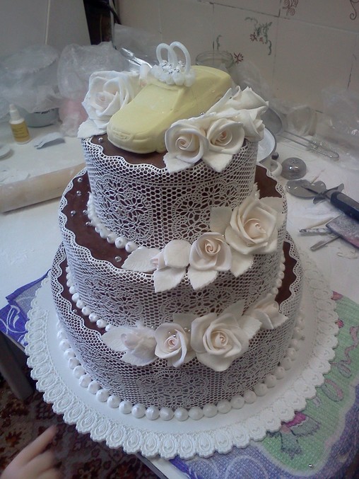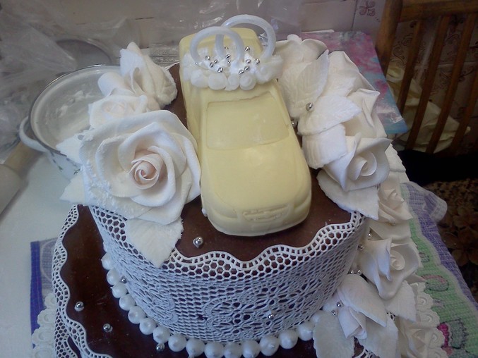 Торты свадебныеМолодым очень захотелось не статуэтку изящной пары на верху торта, а шоколадную свадебную машинку, именно той модели, на которой поедут из ЗАГСа (что-то новенькое лично для меня)) Пришлось заказывать пищевой силикон, купила машинку, залила формочку. Шоколада ушло две плитки, как ни странно, казалось бы маленькая такая. Ну в восторге все были до писка))) Извините за свинарник, не успеваю всё прибрать, только что доделала, сразу увозим на свадьбу.